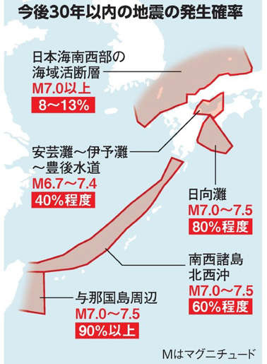 政府の地震調査研究推進本部は25日、宮崎県沖の日向灘や南西諸島海溝周辺など、九州から沖縄を震源とする地震が今後30年以内に発生する確率を公表した。日向灘ではマグニチュード(M)7・0~7・5の地震が80%程度、与那国島周辺では90%以上の確率で起きるとした。M8程度の巨大地震も起きうるという。