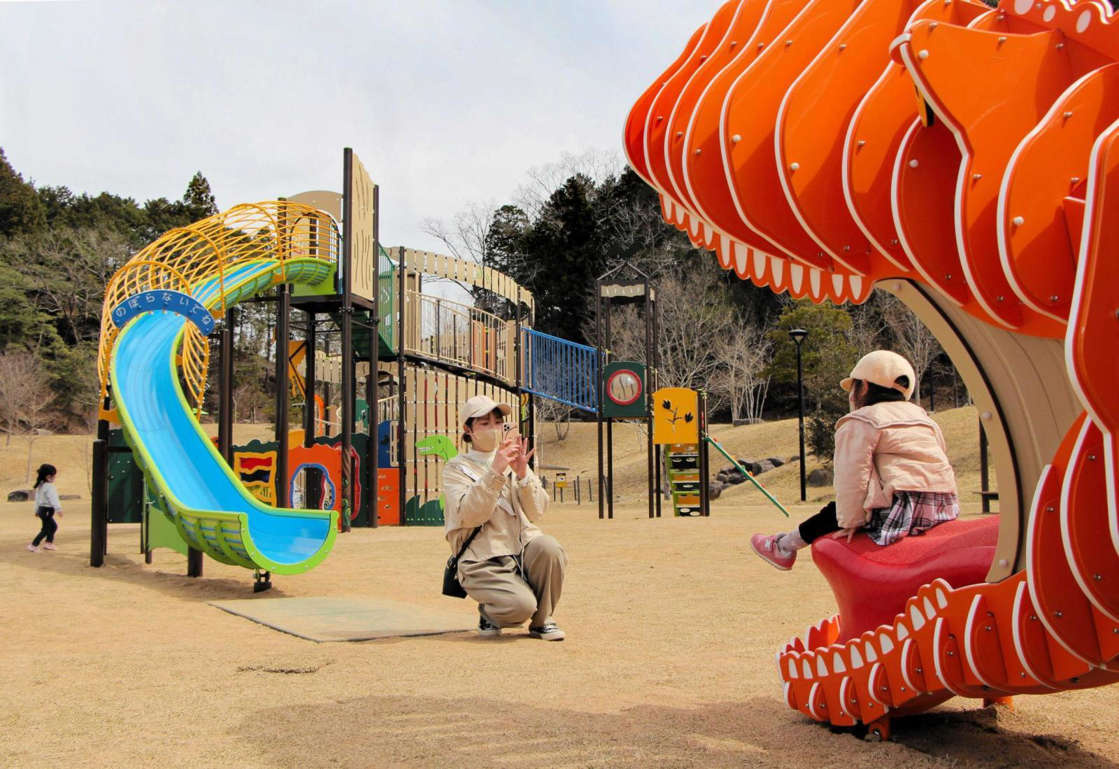 県立丹波並木道中央公園(兵庫県丹波篠山市西古佐)に、恐竜の意匠を凝らした大小の遊具2基が登場した。ティラノサウルスとステゴサウルスが、春休みの子どもたちを出迎えている。